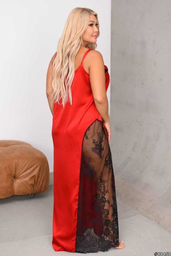 Довга нічна сорочка на регульованих бретелях із вставкою гіпюру на одну ногу.