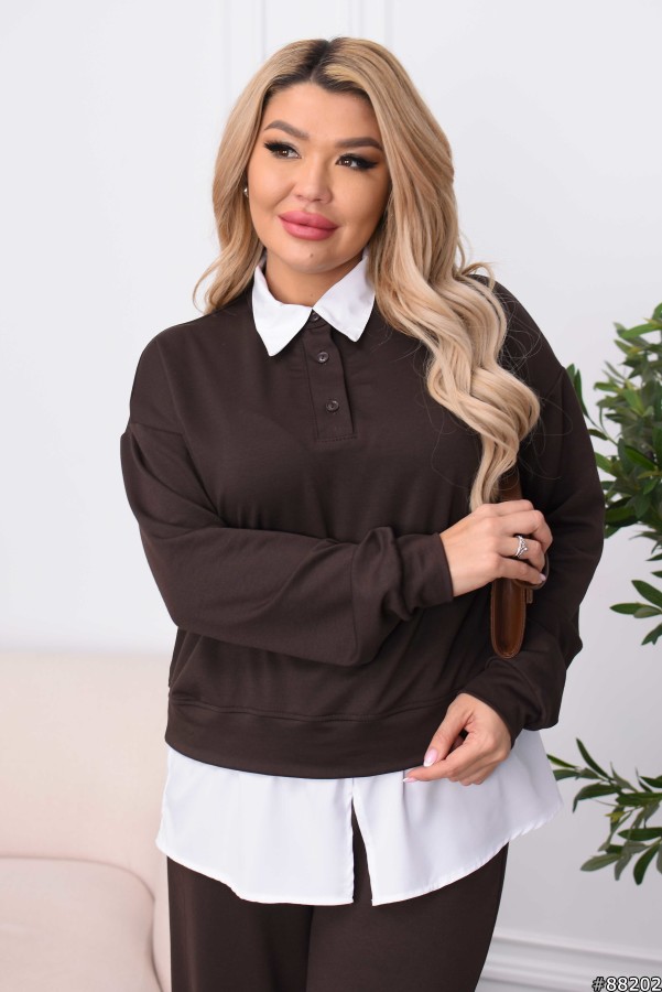 Кофта оригінального крою з ґудзиками ,виконана з трикотажу двонитки з додаванням білого супер софта на комірі та знизу з імітацією сорочки.
