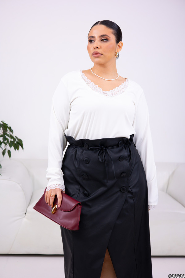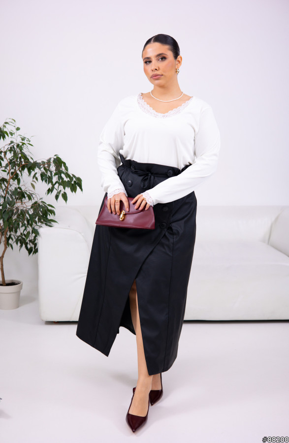 Спідниця на запах, із завищеною талією, застібка функціональні ґудзики, також є шлевки під пояс, поясок у комплекті.