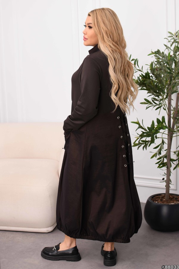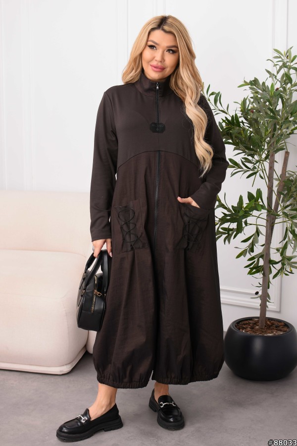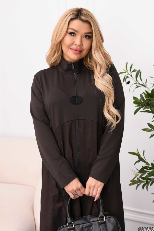 Стійка-горловина з блискавкою до рівня грудей + окрема блискавка від грудей донизу, комбінована фактура (двонитка + жатa плащівка), дві накладні кишені. Ззаду — декоративна шнурівка для регулювання об’єму на талії. Низ на резинці для охайної посад