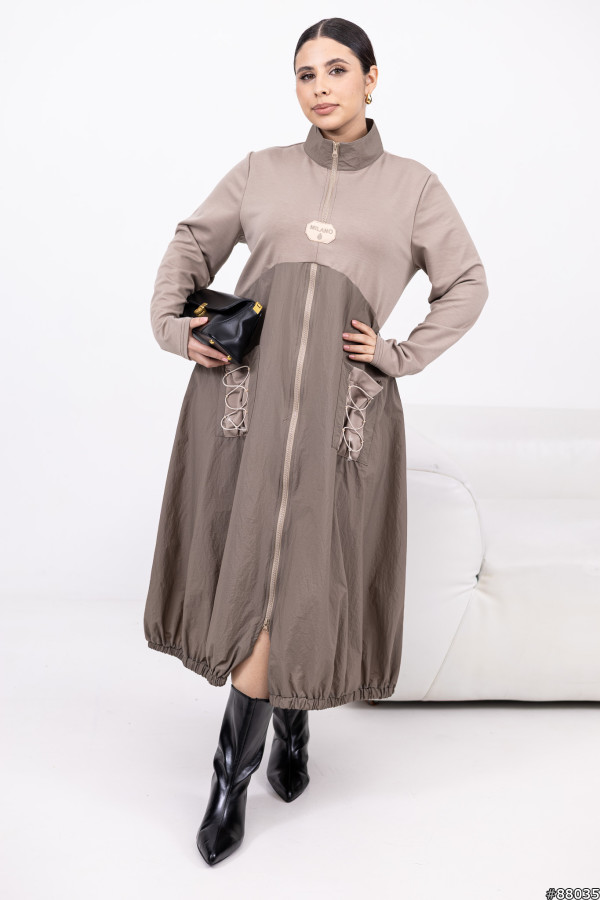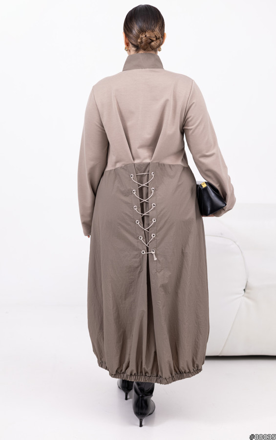 Стійка-горловина з блискавкою до рівня грудей + окрема блискавка від грудей донизу, комбінована фактура (двонитка + жатa плащівка), дві накладні кишені. Ззаду — декоративна шнурівка для регулювання об’єму на талії. Низ на резинці для охайної посад